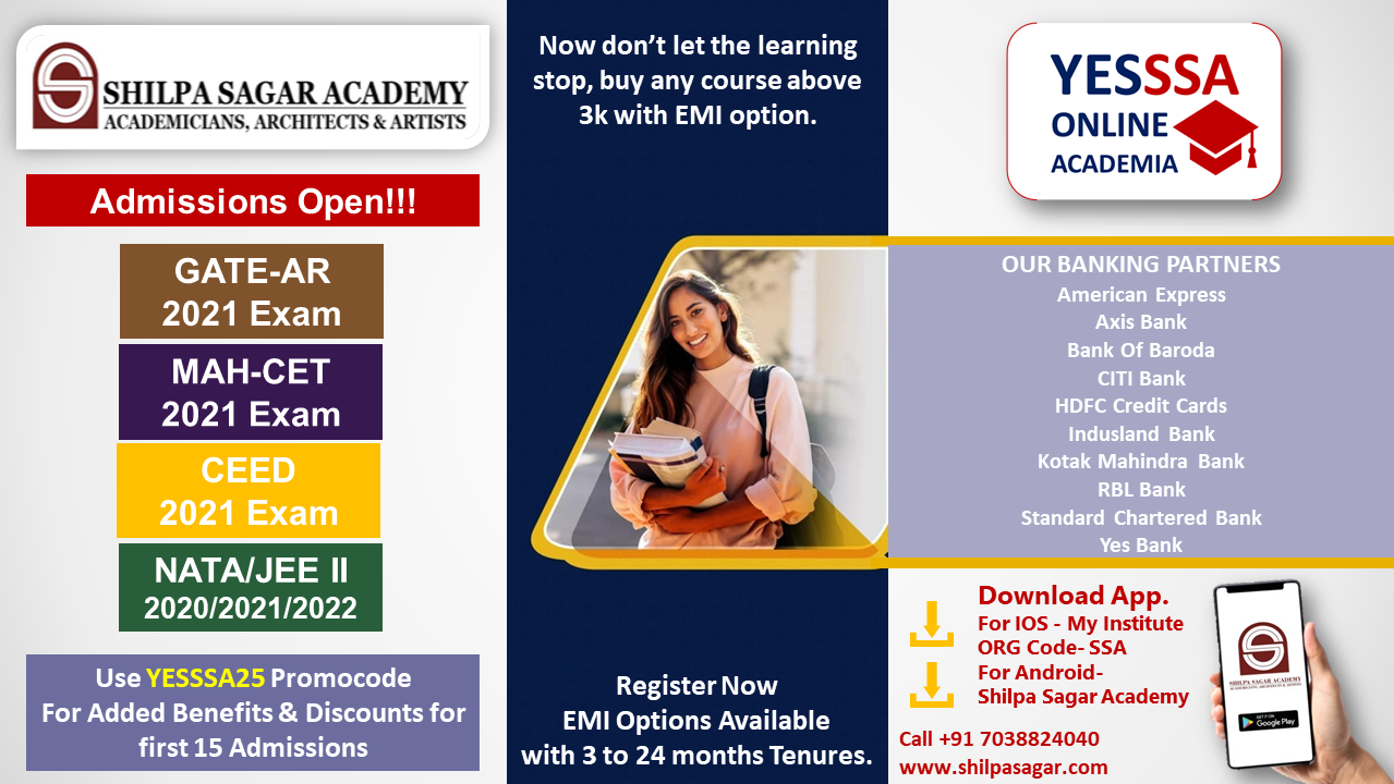 Grab your pass to be a Demi God by enrolling to NATA, JEE MAINS 2, GATE-AR, MAH-CET, IIT(CEED & UCEED), NID(B.DES & M.DES), NIFT, Bachelor of Vocation Interior Design entrance exam coaching courses of Shilpa-Sagar Academy & get familiar with Design attitude. Make yourself available to the opportunity of getting contagious with the achievers in the field, not just to score marks but to understand & feel the nostalgia of innocence in your unexplored mind.